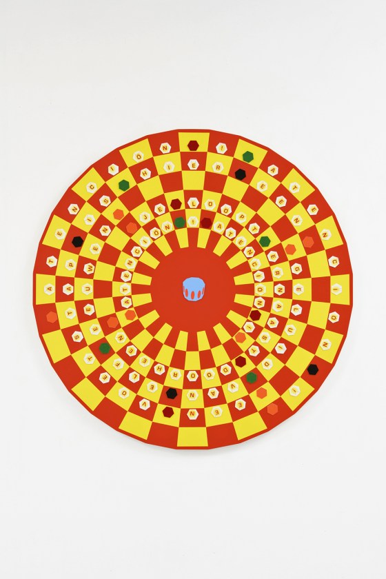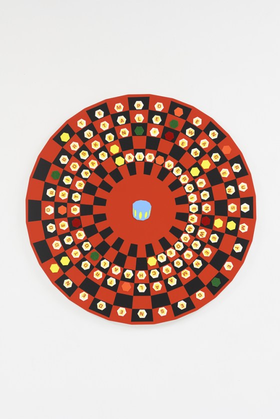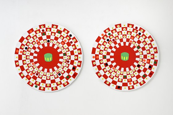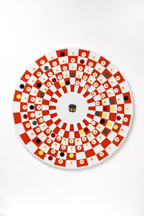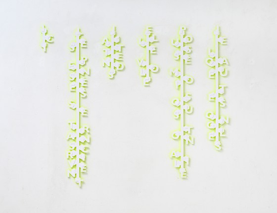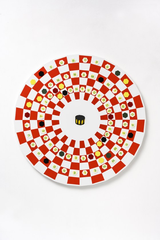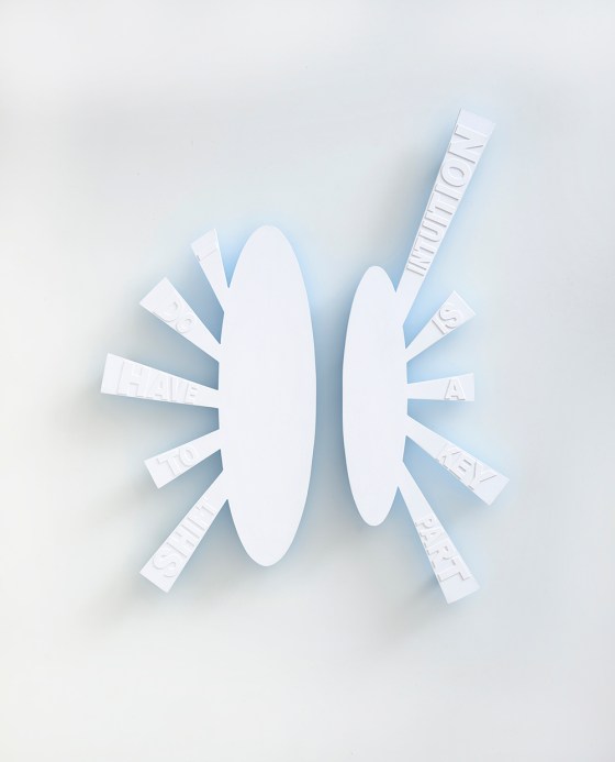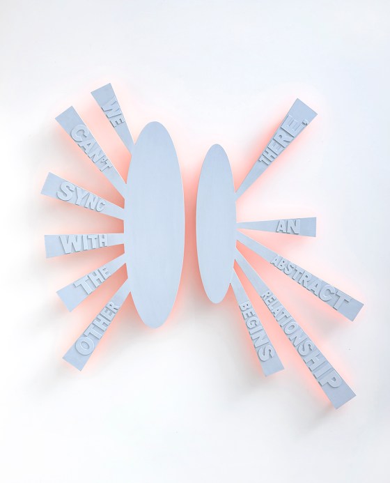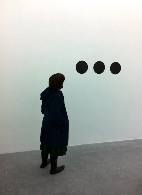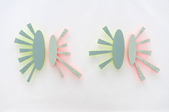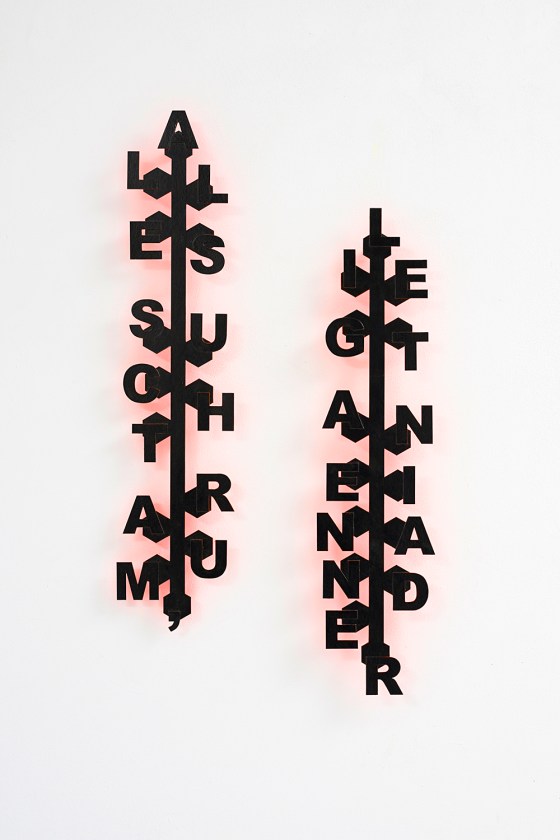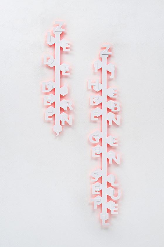 Op de muur in De Fabriek staan twee zinnen van Tucholsky geschreven, als twee geabstraheerde ogen, als twee arena’s. In het midden bevinden zich witte pupillen met een zin uit mijn Sofa Journal, ontstaan door het denken over deze tekst. Een werk met twee stemmen uit 1927 en 2013, een dialoog die 86 jaar overbrugd.