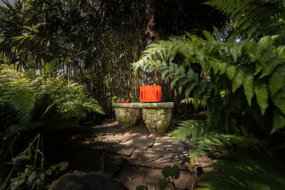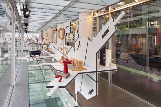 By tilting it against the wall, the pedestal is freed from its task and becomes part of the space.